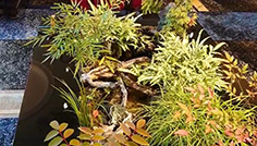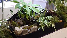 木の枠で囲み、フェイクグリーンと観葉植物を組み合わせて、少しエキゾチックな渓流になりました。